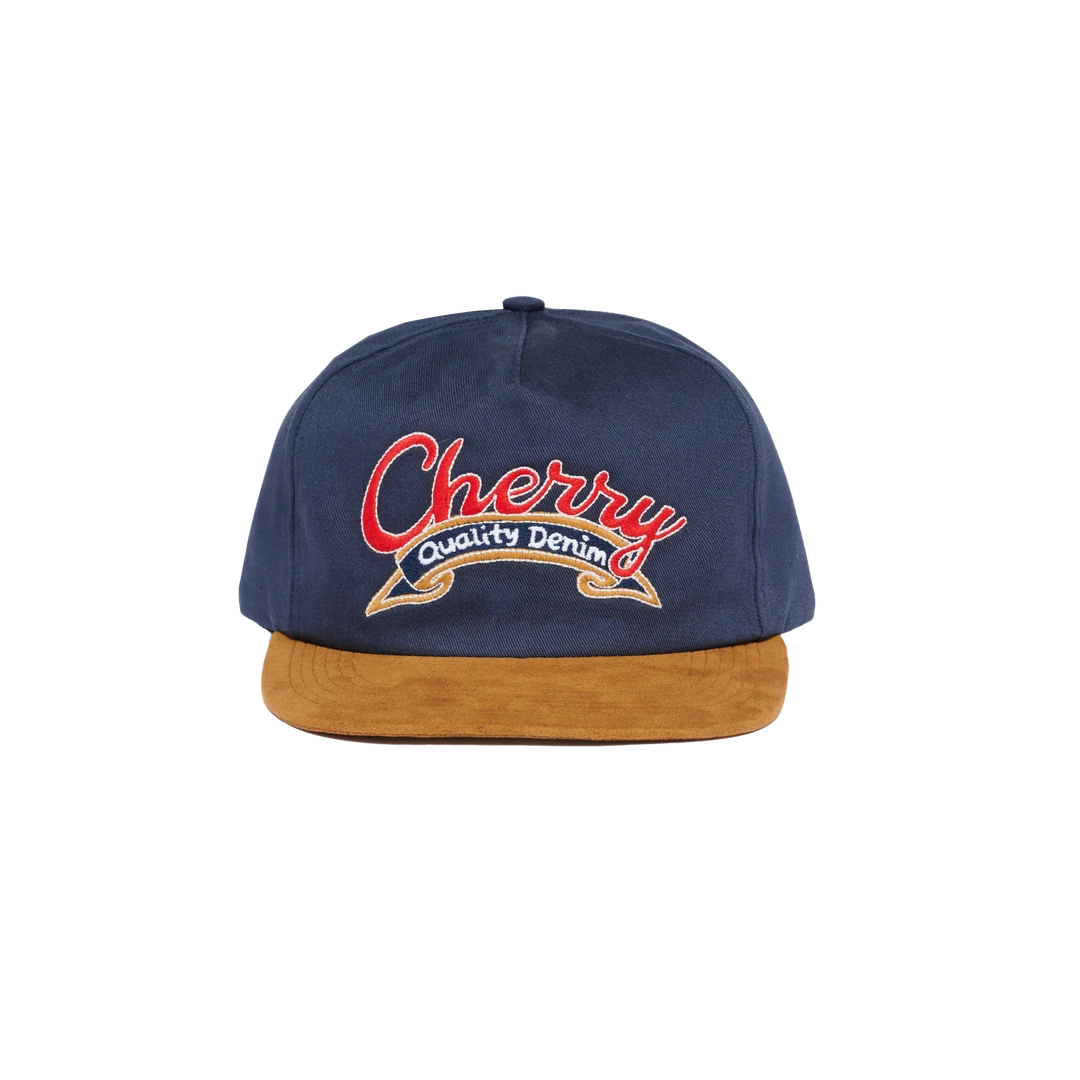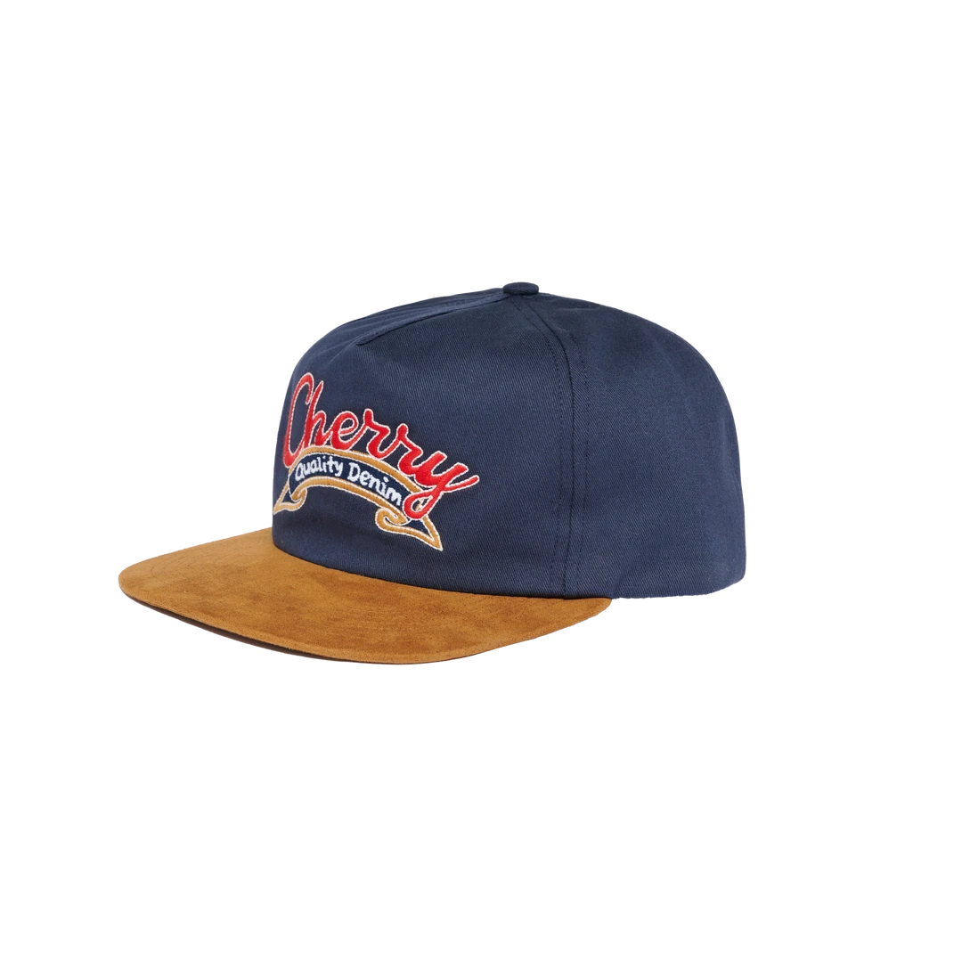 100% Cotton Twill Unstructured 5 Panel Snap Back Hat. Suede Brim. Embroidery on front panel.Â