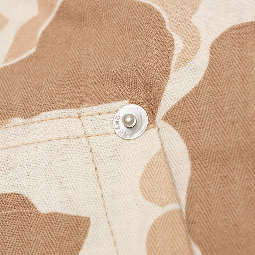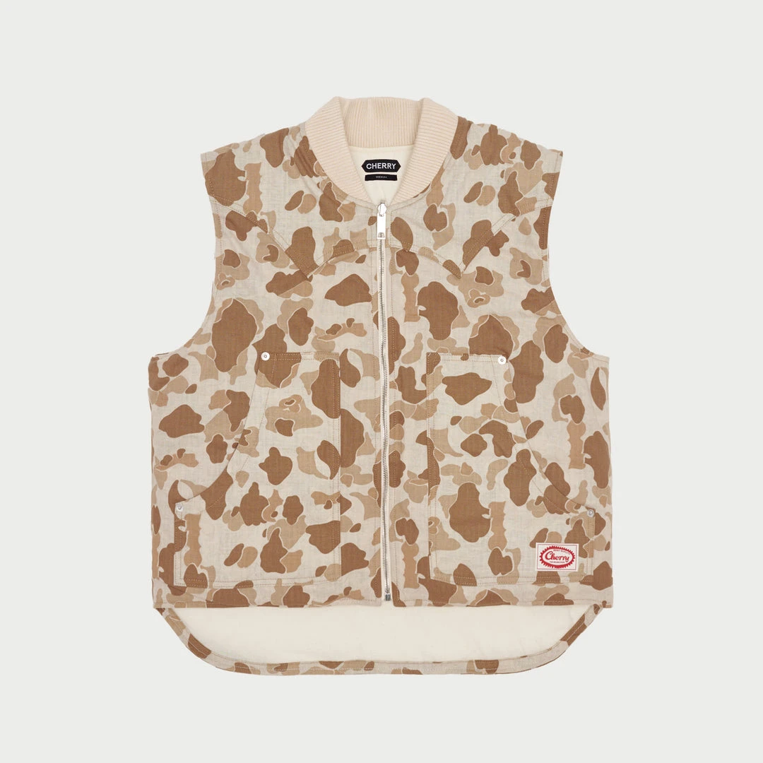 100% Cotton Herringbone Duck Camo Vest. Hand quilted lining with down insert for cold temperatures. Label on front right pocket.