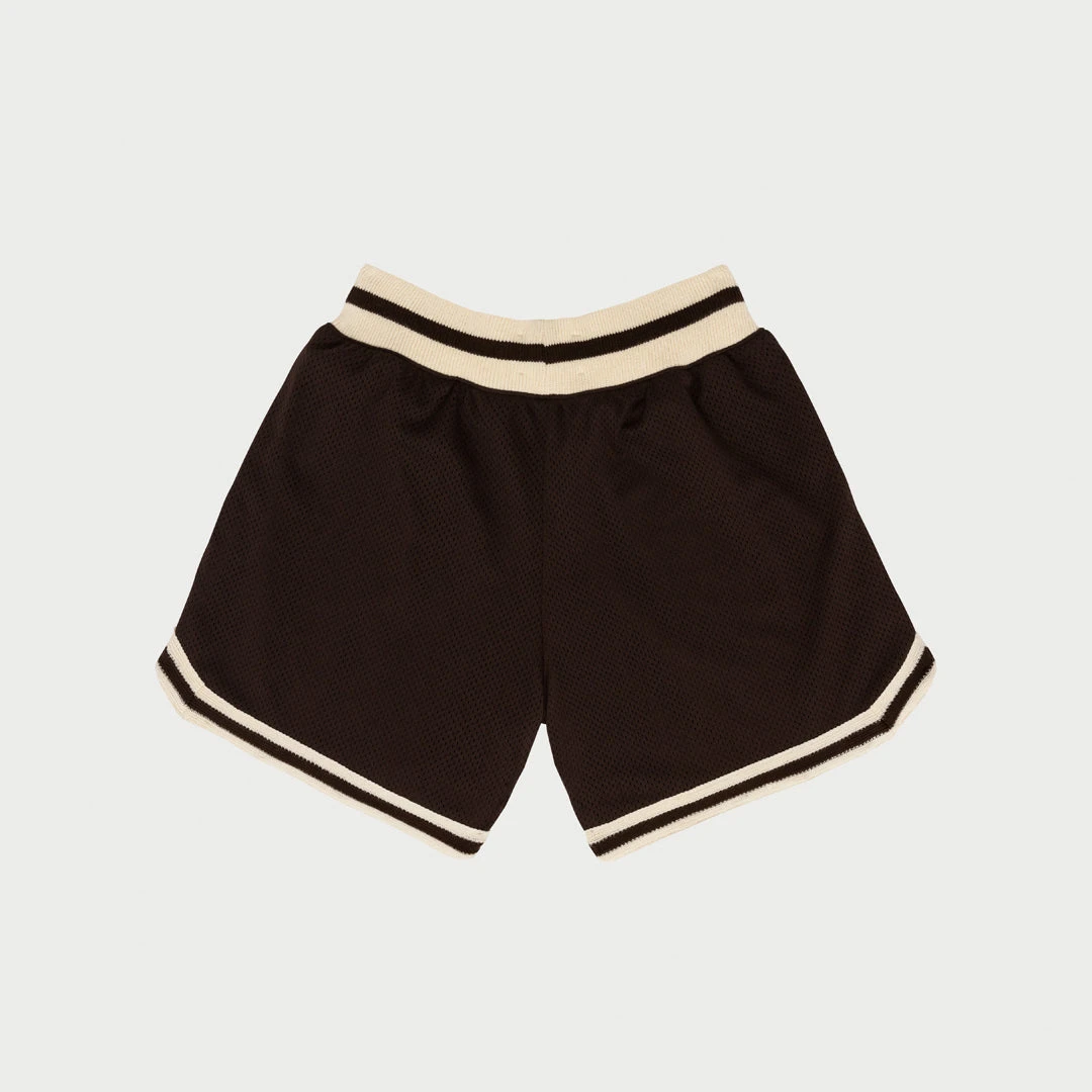 6 inch inseam heavyweight mesh basketball shorts with cotton waistband. Drawstring in interior of waistband. Traditional cotton knit tape made with 100 year old knitting machine in Los Angeles. Screenprint embellishment on left leg.Â