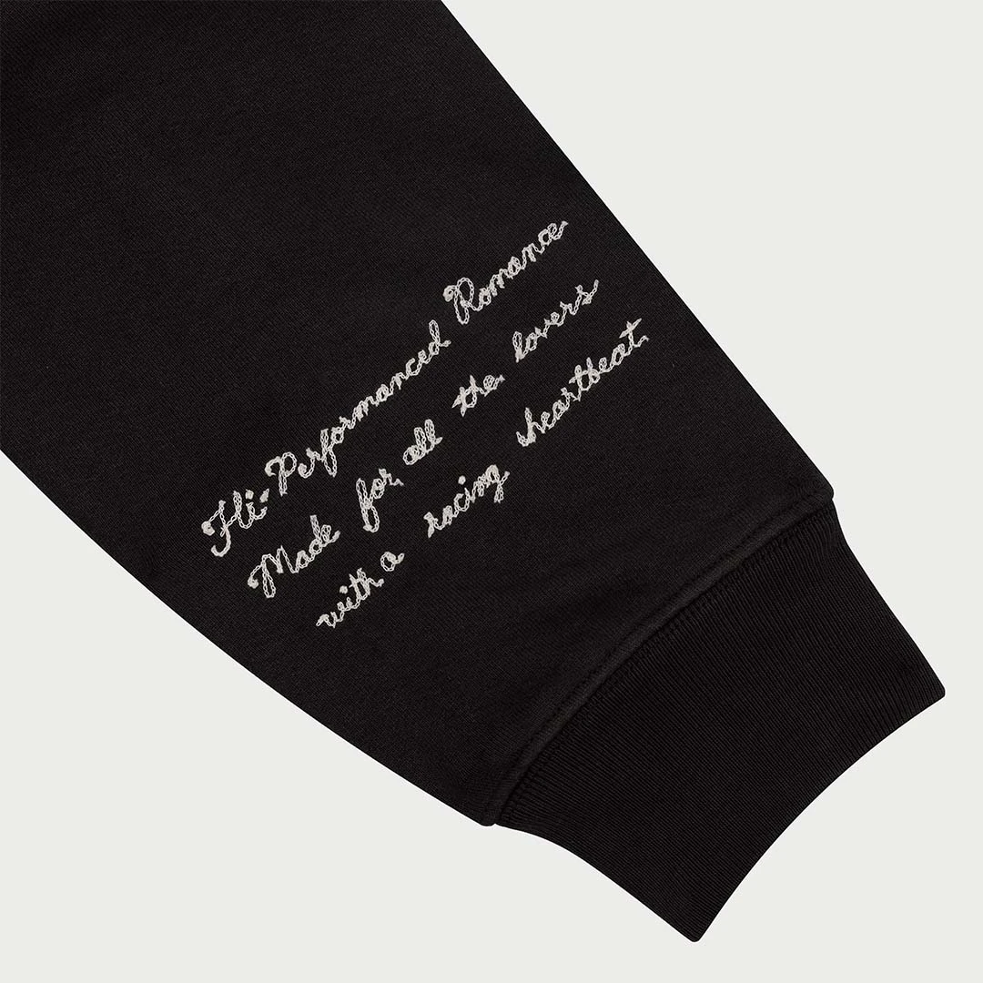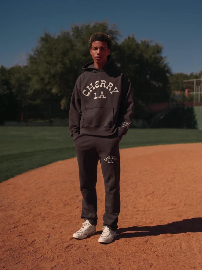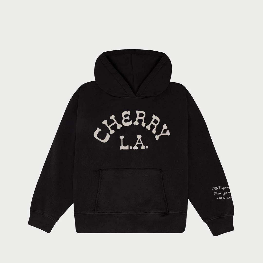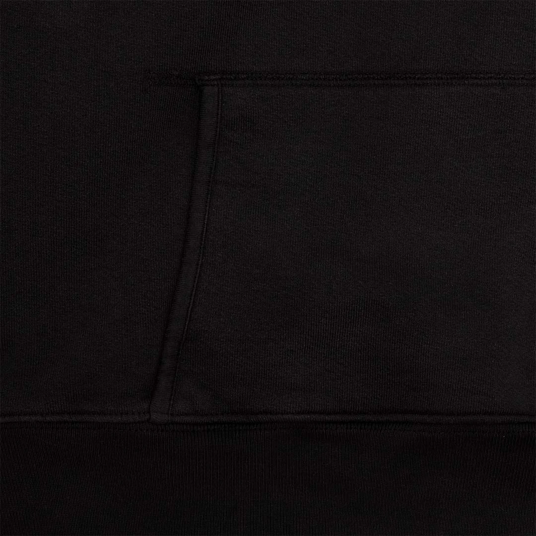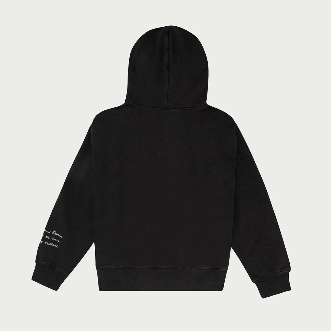 100% Cotton Mid-weight Fleece Hooded Pullover Sweatshirt. Boxy and cropped fit. Garment dyed and washed for soft vintage hand-feel. Custom felt letter patches on center chest and chain stitch embroidery on left arm.Â