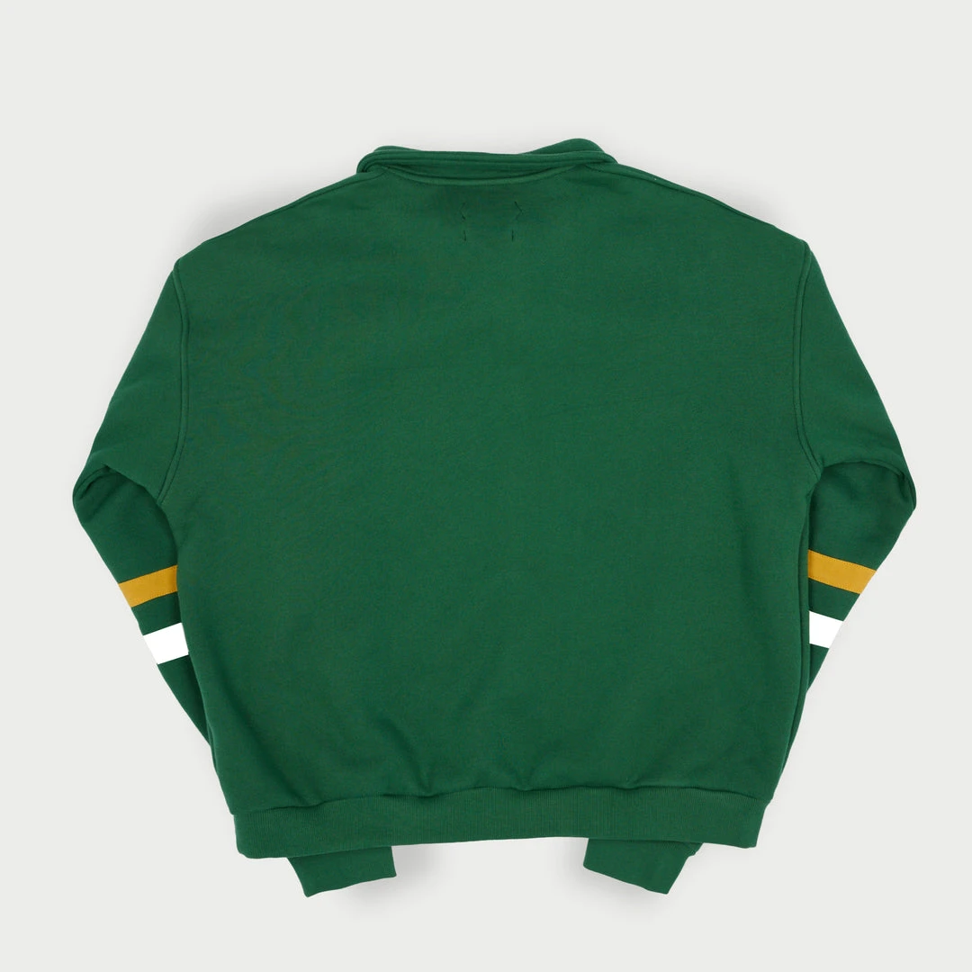 Polo Fleece Henley Made in Los Angeles. 100% Cotton Heavy Fleece. Contrast stripes on arms. Embroidered Patch on left chest. Horn Buttons.Â