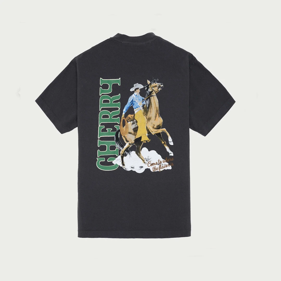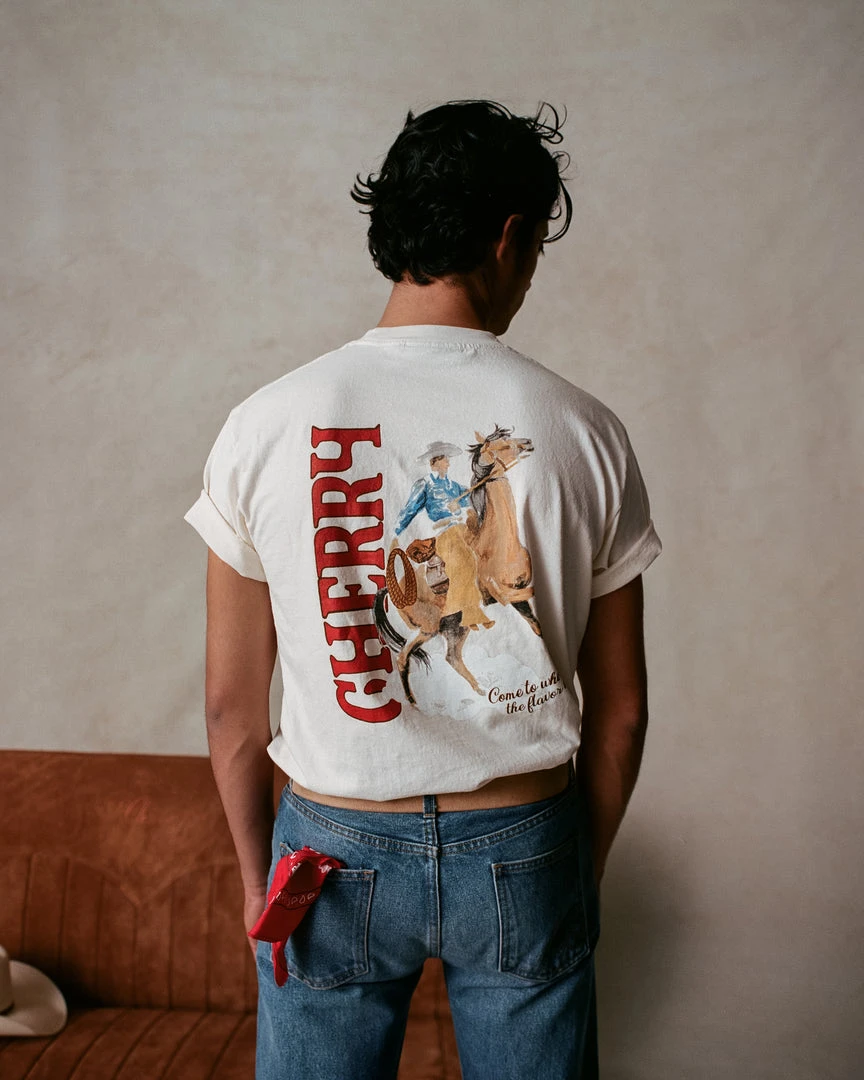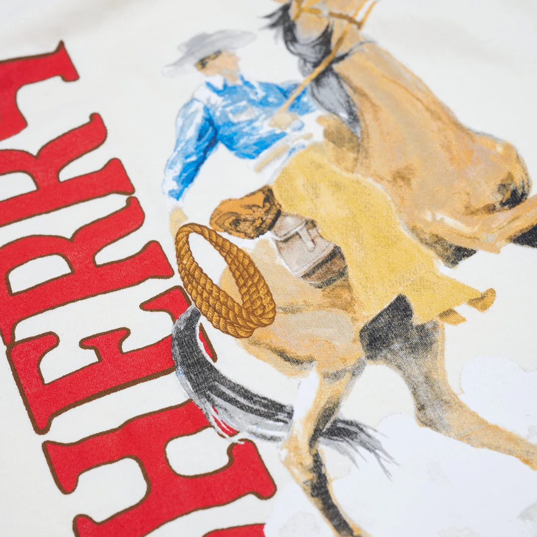 6.5oz 100% USA Cotton. Hand printed with plastisol ink on front chest. Rinsed and washed for soft hand-feel.Â