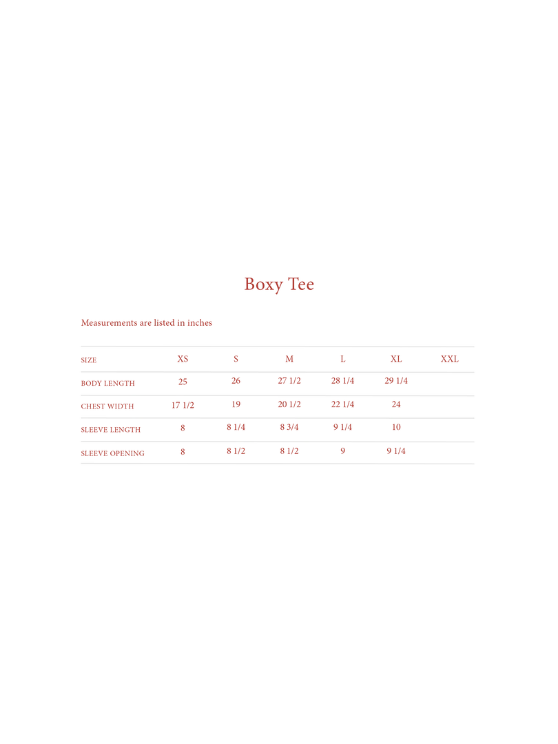 6.5oz 100% USA Cotton Boxy T-Shirt. Fits boxy and oversized, size down for more slim fit. Hand printed with plastisol ink on front. Rinsed and washed for soft hand-feel.Â