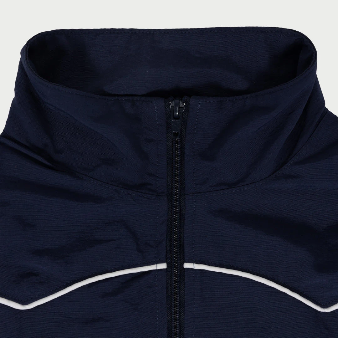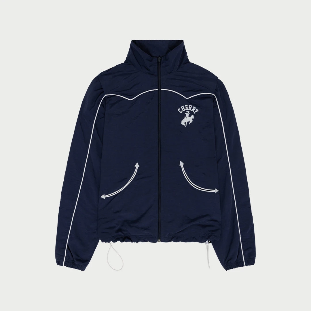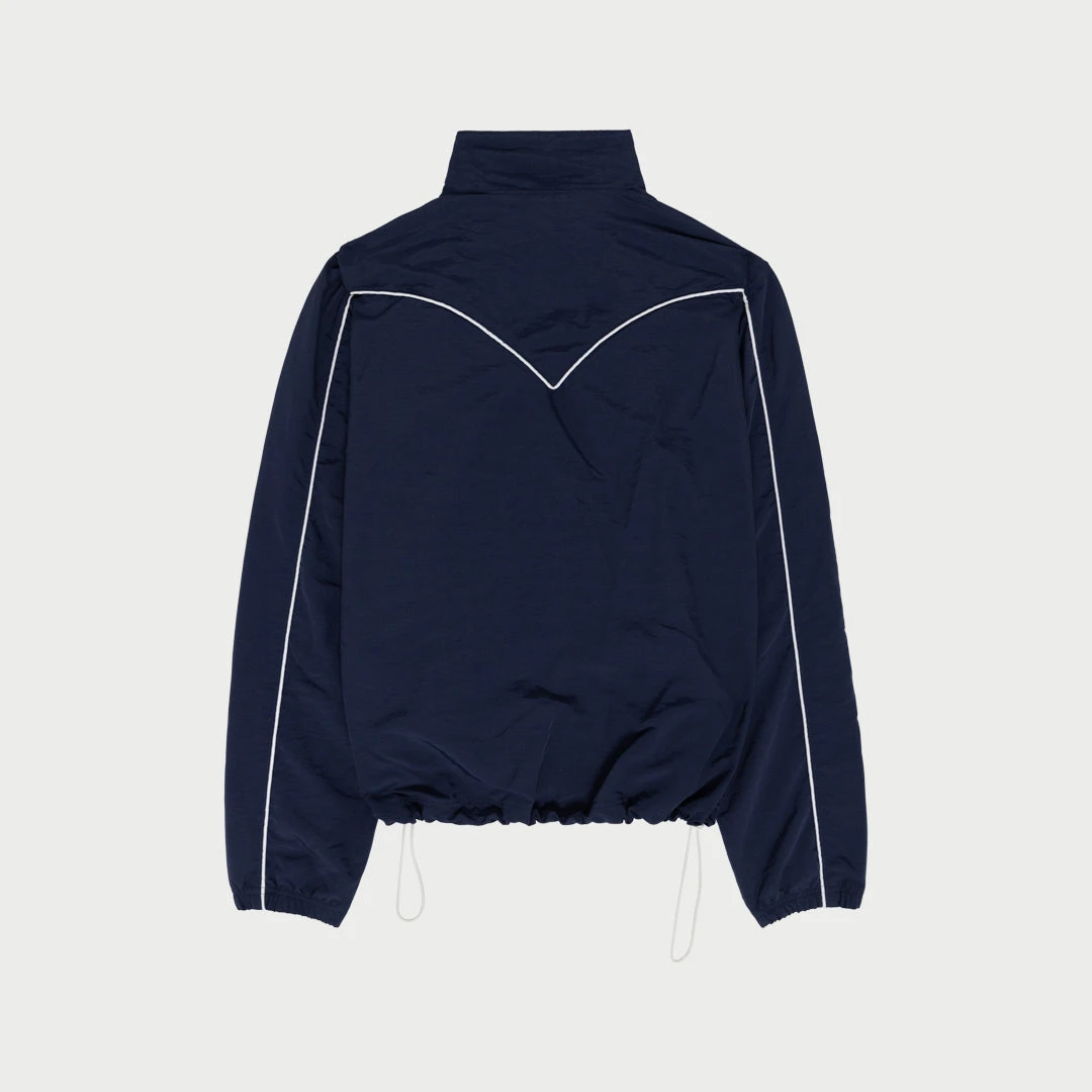 Nylon track jacket outer. Sport mesh lining. Cotton piping western influenced details. Bungee waist. Tonal nylon coil zipper.Â