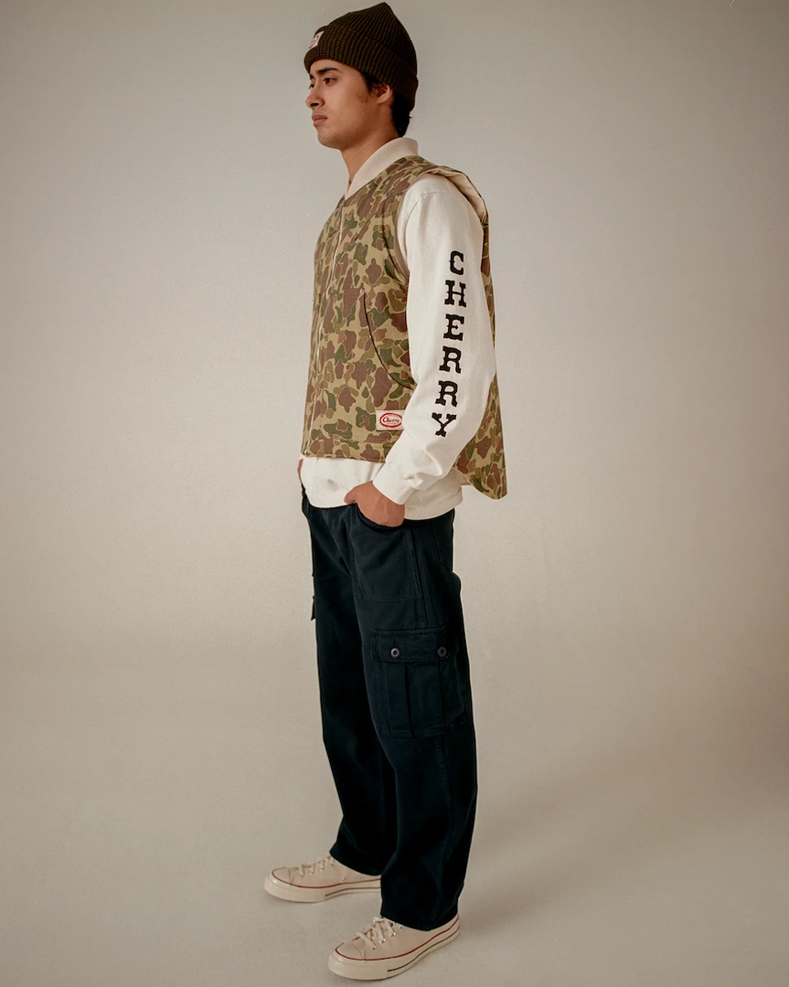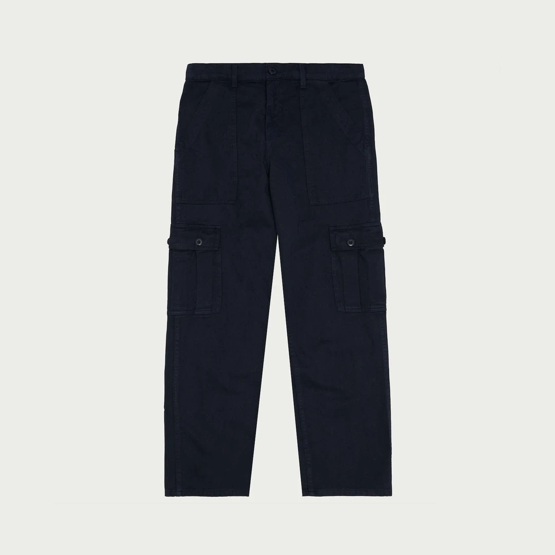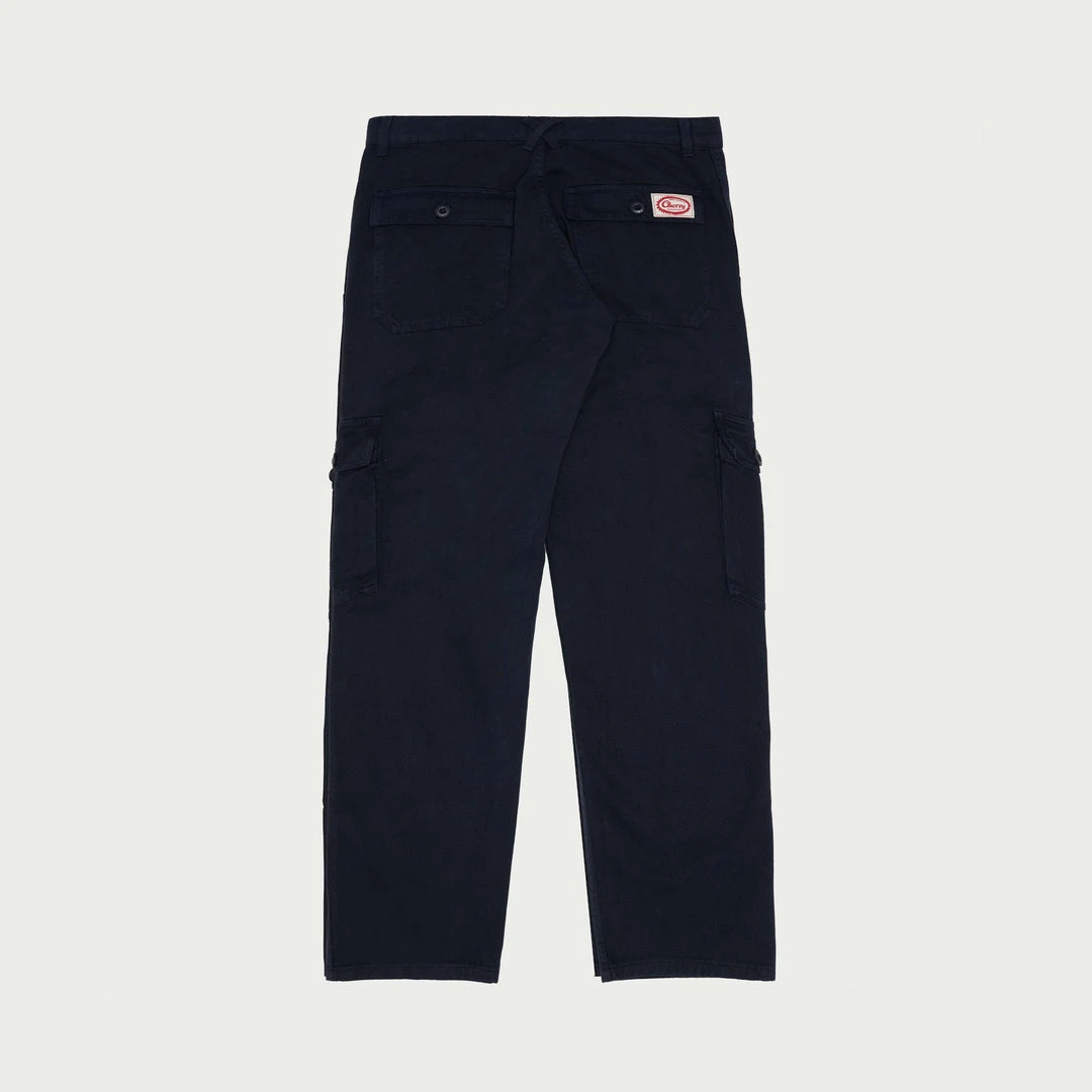 100% Cotton Twill Work Cargo Pants. Slightly contrasted pockets. Custom dyed button closure under cargo pockets and back pockets. Cherry Button closure & top and patch on back wearers right.